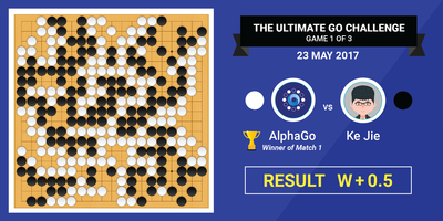 Now behind in the balance of territory, Ke Jie was obliged to make the most of the upper side, and attempted to do so on a grand scale with the ambitious two-space jump of 97. AlphaGo's collected response at 98 forced Ke Jie to cut off the single white stone with 99, a decisive move that initiated the last major exchange of the game. Heading into the endgame, Ke Jie responded with vigour, but AlphaGo emerged with a modest but secure lead, ultimately winning by a half point.